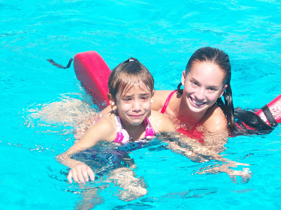 Okay if you know me and Adam then you know what "fish" we were when growing up. I swam competively for I think a little over 6 years. Adam basically lived in the water during his summer breaks. So given our background you would think our girls would LOVE the water, right? Well you couldnt be more wrong! Our girls are scared out of their mind of the water!! And when I scared I mean horrified! Since I used to be a swim teacher and what not I always just assumed I would teach our kids how to swim. But that's kinda hard when you dont have a pool or easy access to one. So this summer we finally signed them up (the big two anyways) for lessons. Two weeks, Mon-Thurs. K let's start with Hailey. She shed some tears in the beginning of her first class. But sucked it up pretty quick! Kyleigh was in her class so I am guessing that helped too. Here are some pics from her first class